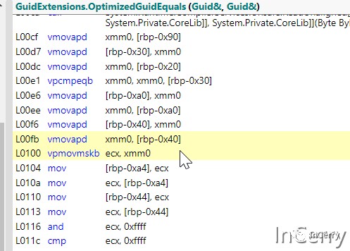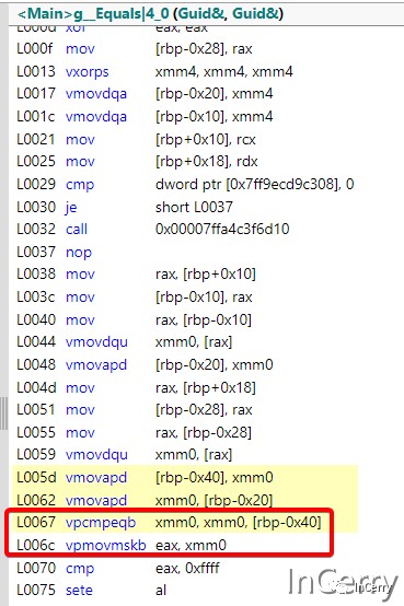 最后 right Guid 也使用相同的方式加载,最后使用==比较两个Vector是否相等就好了。其实==还使用了CompareEqual和MoveMask两个指令,只是在.NET7 中 JIT 会把两个向量的比较给优化。看下方图片中红色框标记的部分,就是这两个指令。