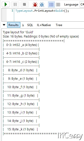 我们使用ObjectLayoutInspector可以打印出 Guid 的数据结构,数据结果如下图所示,和我们源码里面看到的一致:
