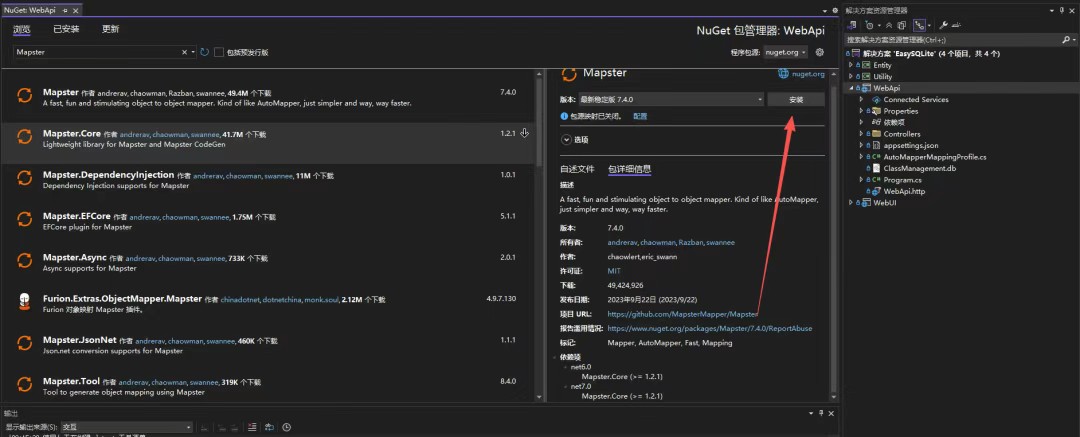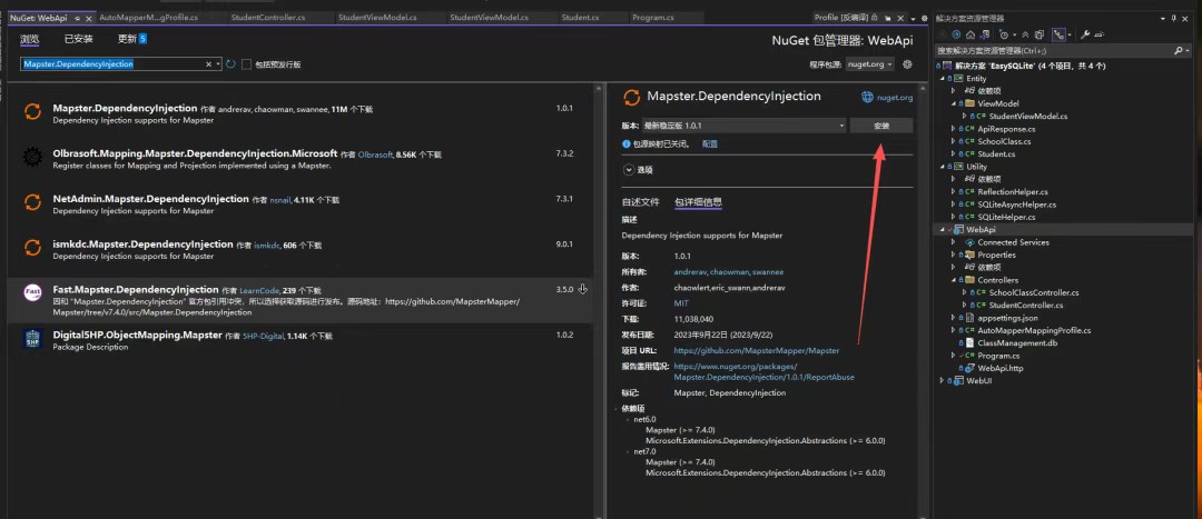 在 NuGet 包管理器中搜索:Mapster 和 Mapster.DependencyInjection 安装: