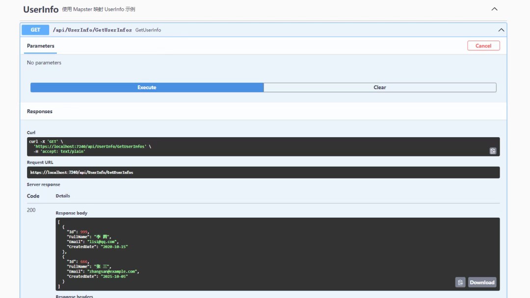 ////// 使用 Mapster 映射 UserInfo 示例 /// [ApiController] [Route("api/[controller]/[action]")] publicclassUserInfoController : ControllerBase { privatereadonly IMapper _mapper; ////// 依赖注入 /// /// mapper public UserInfoController(IMapper mapper) { _mapper = mapper; } ////// GetUserInfo /// /// [HttpGet] public List GetUserInfos() { var userInfos = new List { new UserInfo { Id = 999, FirstName = "李", LastName = "四", Email = "lisi@qq.com", CreatedAt = DateTime.Now.AddYears(-5) }, new UserInfo { Id = 666, FirstName = "张", LastName = "三", Email = "zhangsan@example.com", CreatedAt = DateTime.UtcNow.AddDays(-10) } }; // 使用 Mapster 映射 var getUserInfoViewModels = _mapper.Map>(userInfos); return getUserInfoViewModels; } }