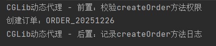 • proxy.createOrder("ORDER_20251226");:调用代理对象方法,触发intercept方法,执行增强逻辑和目标方法调用。