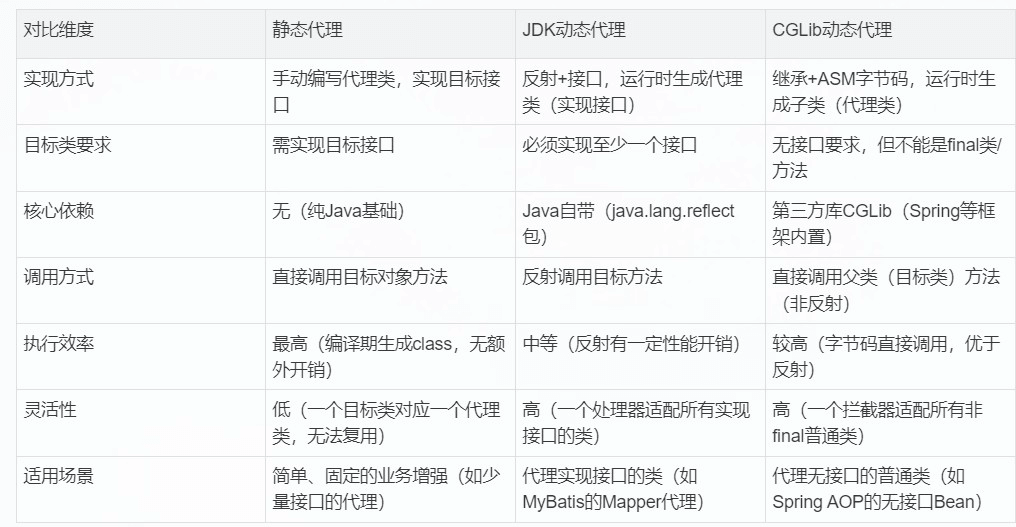 1. 静态代理适合简单、固定的业务场景,执行效率高但灵活性差;JDK 动态代理依赖接口和反射,适配多数有接口的代理场景;CGLib 通过继承实现,适合无接口的普通类代理,性能优于 JDK 动态代理。