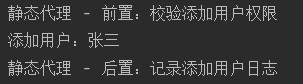 System.out.println("静态代理 - 前置:校验添加用户权限");