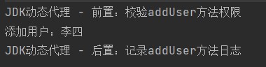 • 重写addUser方法:这是代理的核心逻辑。先执行前置增强(权限校验),再通过target.addUser(username)调用目标对象的核心业务方法,最后执行后置增强(日志记录)——用户调用的是代理类的方法,全程不直接接触目标对象,实现了对目标对象的控制。