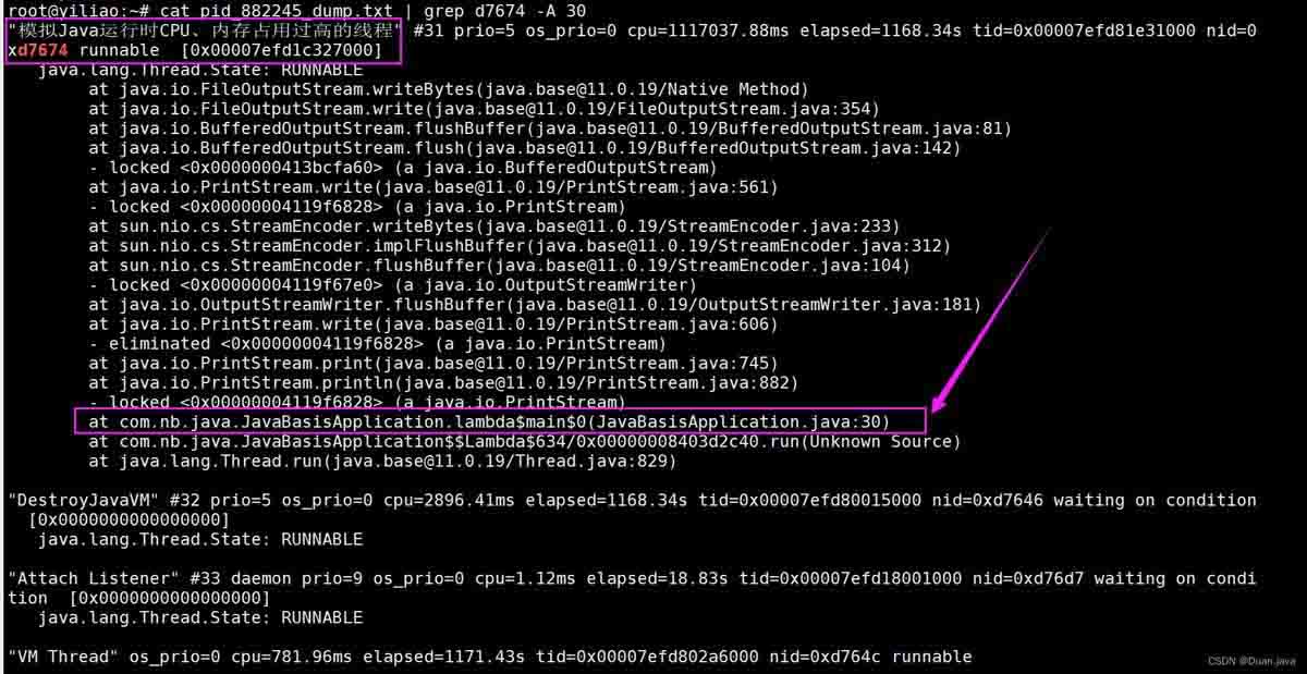 root@yiliao:~# cat pid_882245_dump.txt | grep d7674 -A 30 "模拟Java运行时CPU、内存占用过高的线程" #31 prio=5 os_prio=0 cpu=1117037.88ms elapsed=1168.34s tid=0x00007efd81e31000 nid=0xd7674 runnable [0x00007efd1c327000] java.lang.Thread.State: RUNNABLE at java.io.FileOutputStream.writeBytes(java.base@11.0.19/Native Method) at java.io.FileOutputStream.write(java.base@11.0.19/FileOutputStream.java:354) at java.io.BufferedOutputStream.flushBuffer(java.base@11.0.19/BufferedOutputStream.java:81) at java.io.BufferedOutputStream.flush(java.base@11.0.19/BufferedOutputStream.java:142) - locked (a java.io.BufferedOutputStream) at java.io.PrintStream.write(java.base@11.0.19/PrintStream.java:561) - locked (a java.io.PrintStream) at sun.nio.cs.StreamEncoder.writeBytes(java.base@11.0.19/StreamEncoder.java:233) at sun.nio.cs.StreamEncoder.implFlushBuffer(java.base@11.0.19/StreamEncoder.java:312) at sun.nio.cs.StreamEncoder.flushBuffer(java.base@11.0.19/StreamEncoder.java:104) - locked (a java.io.OutputStreamWriter) at java.io.OutputStreamWriter.flushBuffer(java.base@11.0.19/OutputStreamWriter.java:181) at java.io.PrintStream.write(java.base@11.0.19/PrintStream.java:606) - eliminated (a java.io.PrintStream) at java.io.PrintStream.print(java.base@11.0.19/PrintStream.java:745) at java.io.PrintStream.println(java.base@11.0.19/PrintStream.java:882) - locked (a java.io.PrintStream) at com.nb.java.JavaBasisApplication.lambda$main$0(JavaBasisApplication.java:30) at com.nb.java.JavaBasisApplication$$Lambda$634/0x00000008403d2c40.run(Unknown Source) at java.lang.Thread.run(java.base@11.0.19/Thread.java:829) "DestroyJavaVM" #32 prio=5 os_prio=0 cpu=2896.41ms elapsed=1168.34s tid=0x00007efd80015000 nid=0xd7646 waiting on condition [0x0000000000000000] java.lang.Thread.State: RUNNABLE "Attach Listener" #33 daemon prio=9 os_prio=0 cpu=1.12ms elapsed=18.83s tid=0x00007efd18001000 nid=0xd76d7 waiting on condition [0x0000000000000000] java.lang.Thread.State: RUNNABLE "VM Thread" os_prio=0 cpu=781.96ms elapsed=1171.43s tid=0x00007efd802a6000 nid=0xd764c runnable