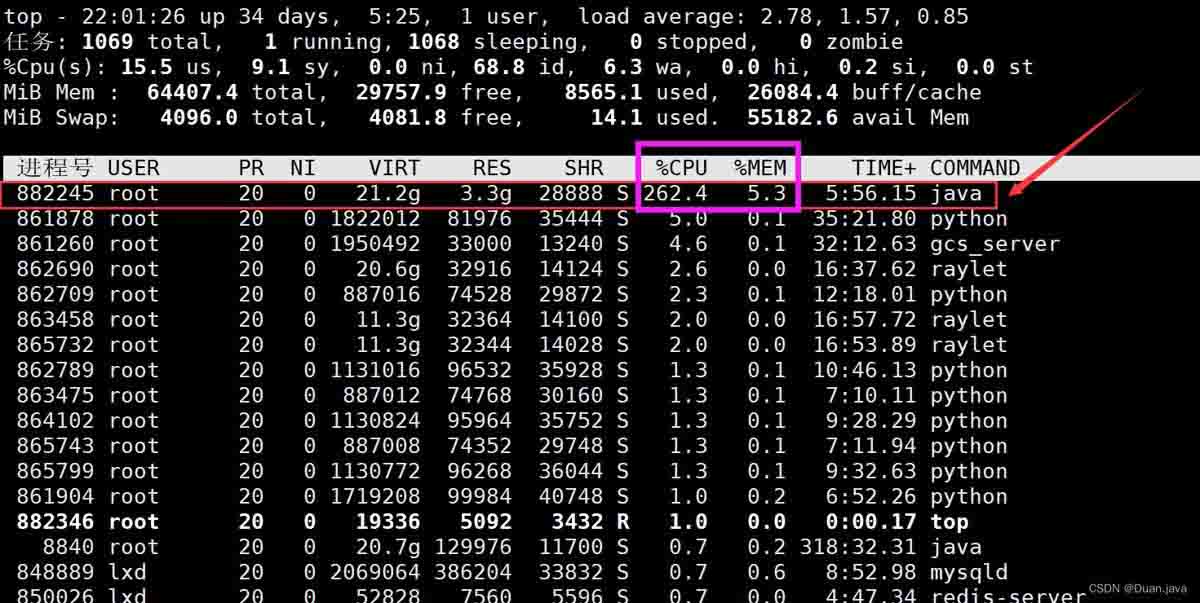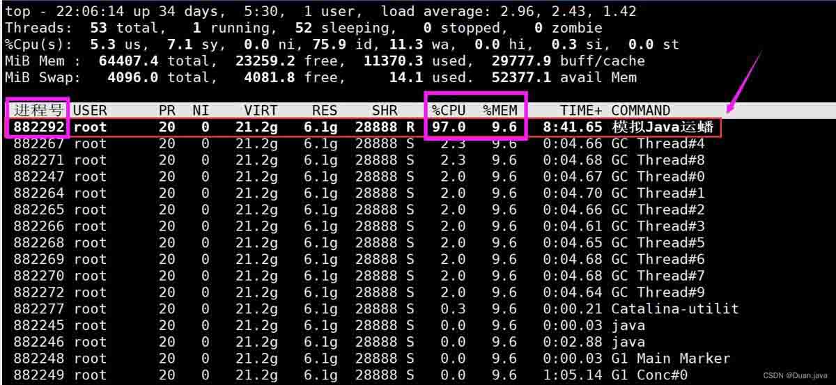 通过top命令可以发现882245这个进程(也就是我们运行的这个java程序)占用的CPU和内存相对来说都是比较高的。