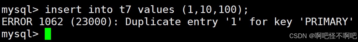 我们在插入值的时候如果给主键或唯一键插入了一样的值那么就会报错。就像下面这样。