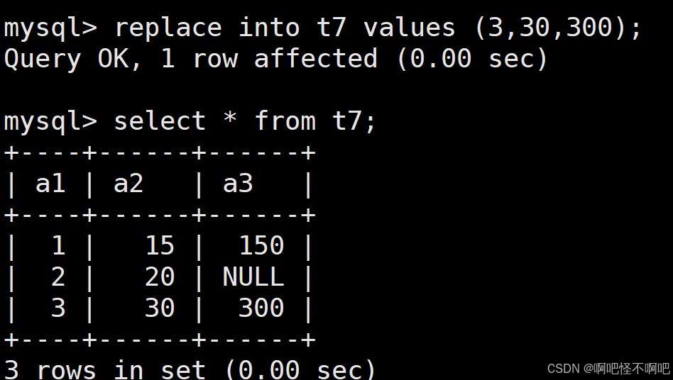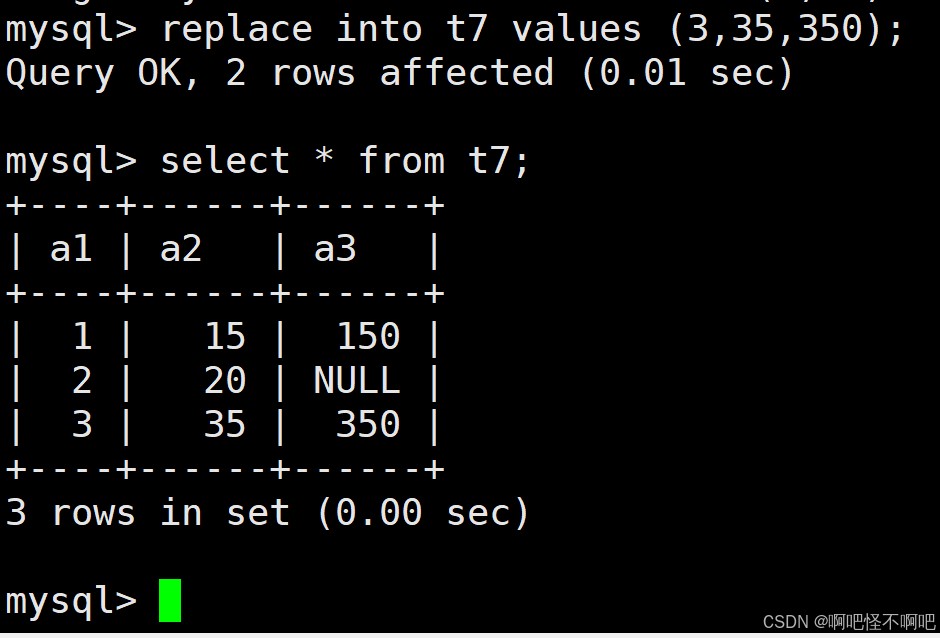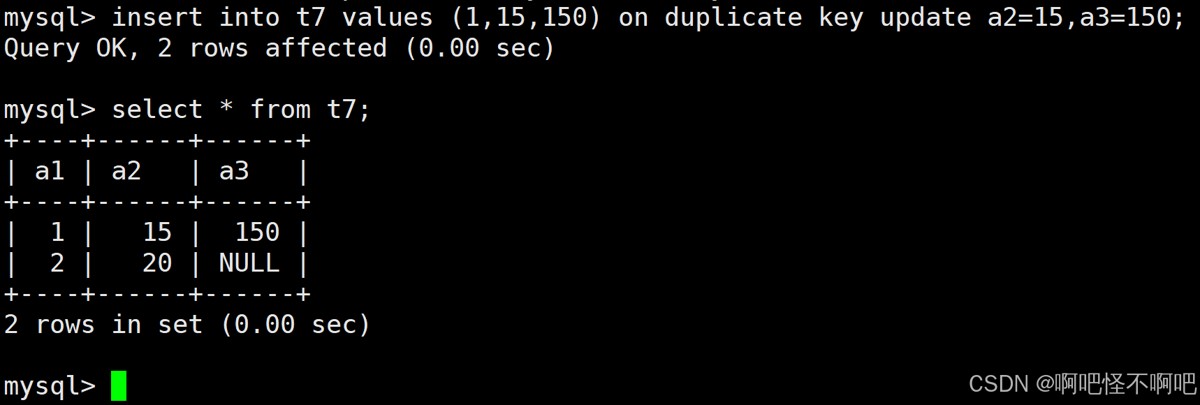 这个时候我们就可以使用这个指令在发生冲突的时候来进行更新,通过额外添加的 on duplicate key update a2=15,a3=150;我们就可以实现修改其已被主键占用的那一行值。