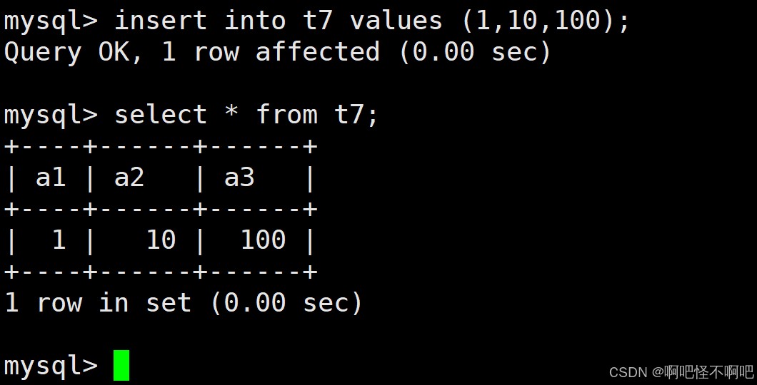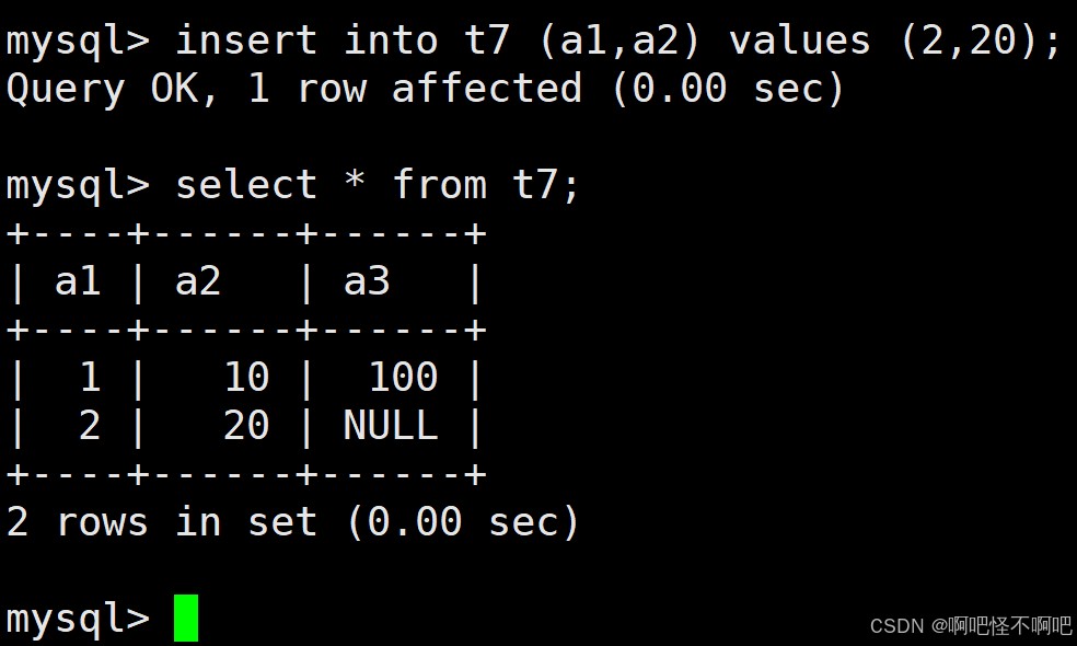 下面这张图就是指定列插入,我们在这里给a1和a2插入了值。那么我们在查看的时候就会发现在这张表的第二行的a3位置就是NULL。