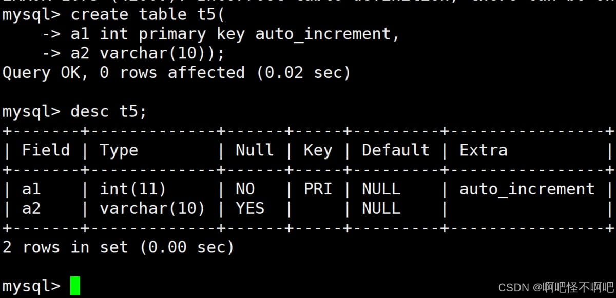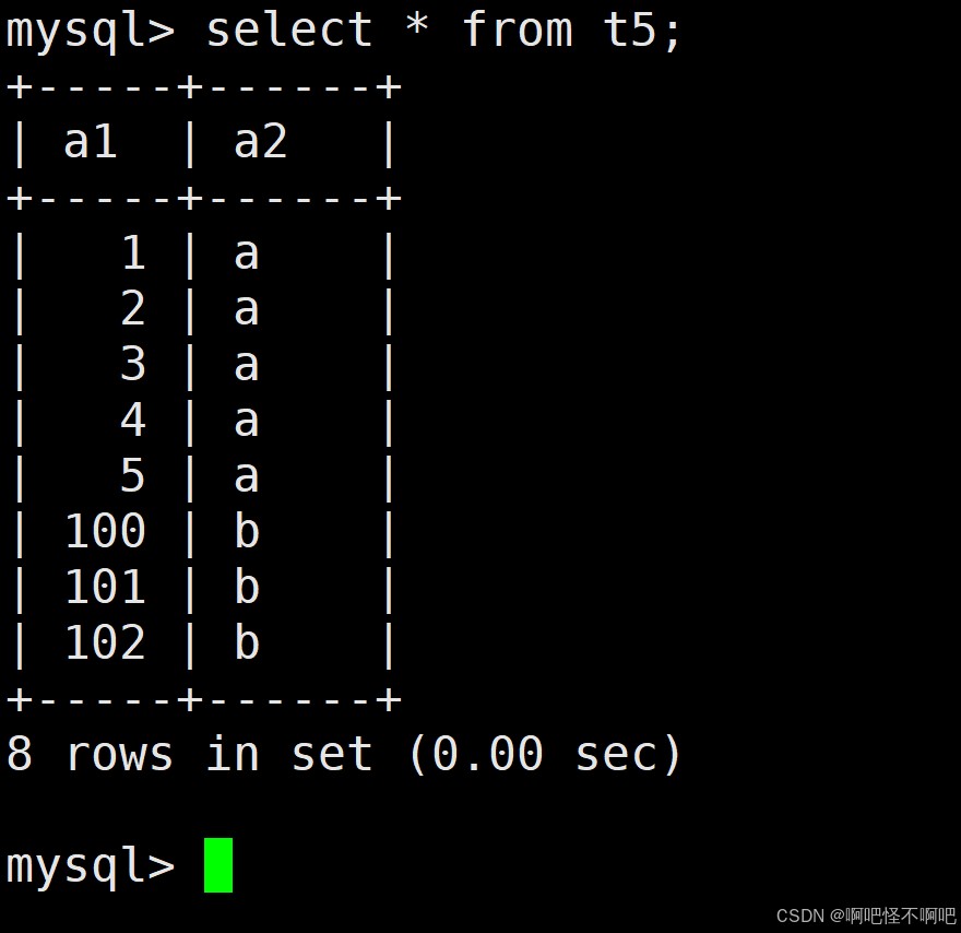 mysql> insert into t5 (a1,a2)values (100,"b");