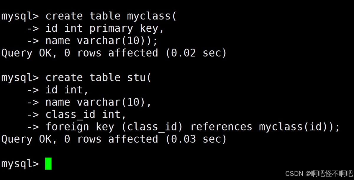 注意:foreign key (字段名) references 主表(列) 这行要写在创建从表时的时候。