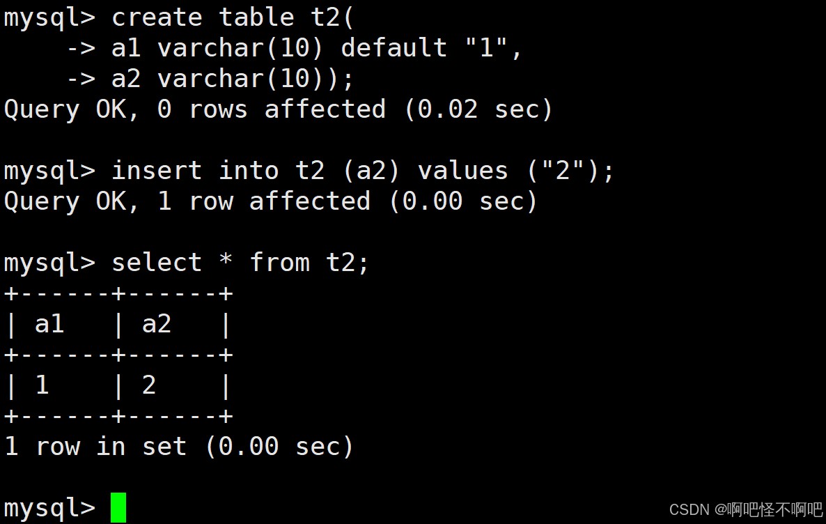 我们看下面这张表格,如果我们设置了其中一个为default,那么哪怕我们不填入,它也会是1。如果我们往a1里面填入了,那么它就是我们填入的值。