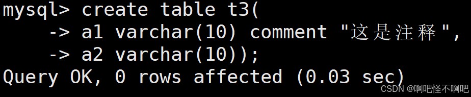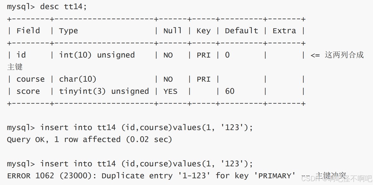 mysql> create table tt14( -> id int unsigned, -> course char(10) comment '课程代码', -> score tinyint unsigned default 60 comment '成绩', -> primary key(id, course) -- id和course为复合主键 -> ); Query OK, 0 rows affected (0.01 sec)