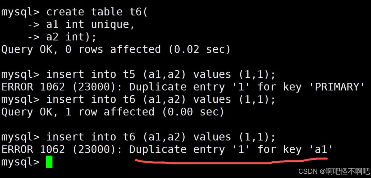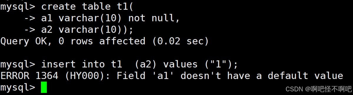 我们看,如果不给a1插入的话,就会报错,因为我们提前设置了要求a1不可以为空。这就是一种约束。