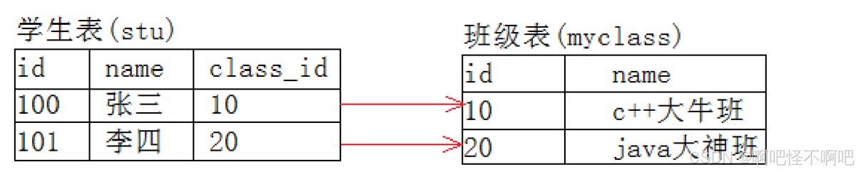 这个比较抽象,我们借用下面这张图来进行说明,foreign key (class_id) references myclass(id)就给两者之间建立了关系。然后现在班级有10和20,那么现在在学生表中插入数据,同时给他的calss_id填入30,那么SQL就会报错。