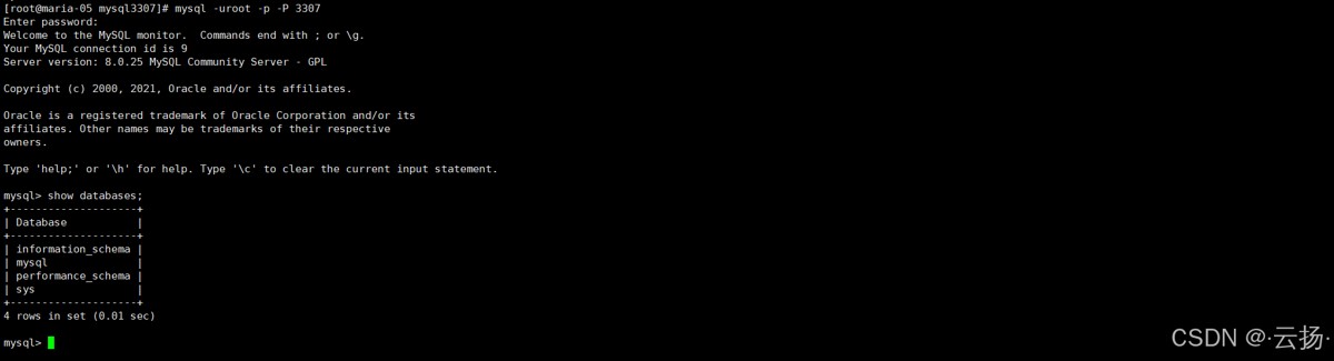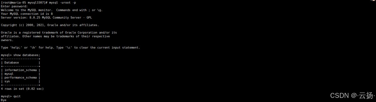 # 登录基础实例(默认3306端口) mysql -uroot -p # 查看数据库列表 show databases; exit; # 登录3307端口的新实例 mysql -uroot -p -P 3307 # 查看数据库列表 show databases; exit; # 如需停止实例,执行以下命令 /etc/init.d/mysql.server stop /etc/init.d/mysql3307.server stop