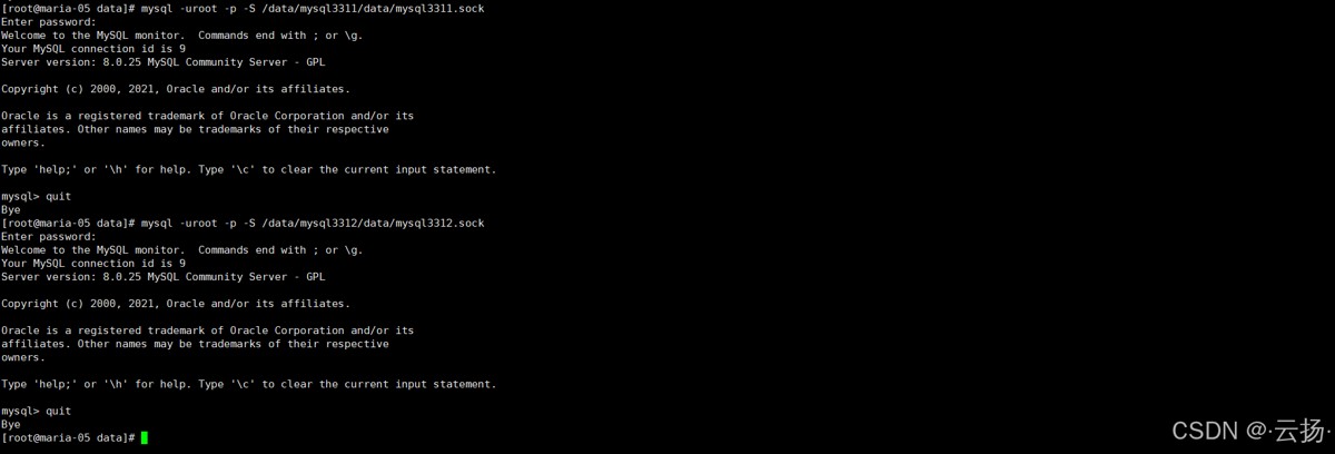 # 登录3311实例 mysql -uroot -p -S /data/mysql3311/data/mysql3311.sock # 登录3312实例 mysql -uroot -p -S /data/mysql3312/data/mysql3312.sock
