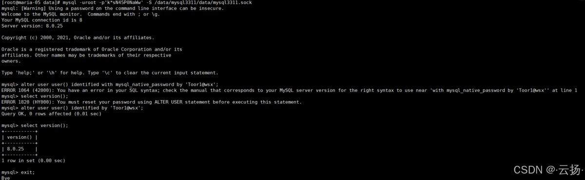 mysql -uroot -p -S /data/mysql3312/data/mysql3312.sock alter user user() identified by 'martin'; exit;