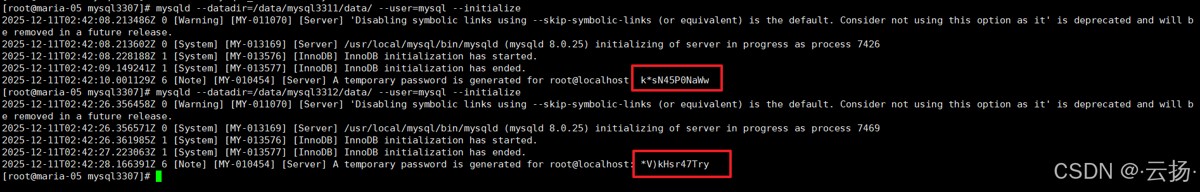 # 初始化3311实例(指定数据目录与运行用户)root@localhost: k*sN45P0NaWw mysqld --datadir=/data/mysql3311/data/ --user=mysql --initialize # 初始化3312实例 root@localhost: *V)kHsr47Try mysqld --datadir=/data/mysql3312/data/ --user=mysql --initialize