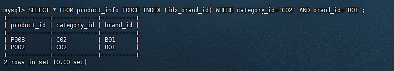 mysql> SELECT * FROM product_info FORCE INDEX (idx_brand_id) WHERE category_id='C02' AND brand_id='B01';+------------+-------------+----------+| product_id | category_id | brand_id |+------------+-------------+----------+| P003 | C02 | B01 || P002 | C02 | B01 |+------------+-------------+----------+