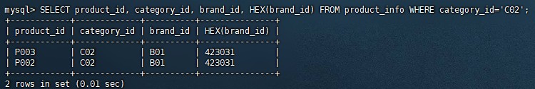 SELECT product_id, category_id, brand_id, HEX(brand_id) FROM product_info WHERE category_id='C02';