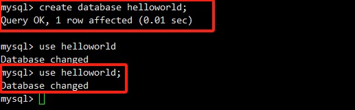 执行use helloworld;命令后,MySQL返回Database changed,确认当前工作数据库已切换。