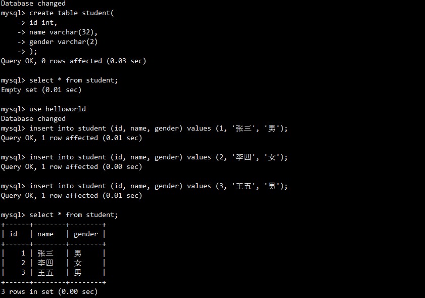 insert into student (id, name, gender) values (1, '张三', '男'); insert into student (id, name, gender) values (2, '李四', '女');