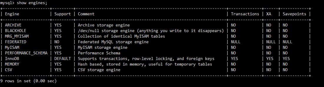 show engines;命令的输出结果。这个表格列出了所有可用的存储引擎,其中Engine列是名称,Support列表示是否可用,DEFAULT表示该引擎是当前服务器的默认存储引擎。Transactions和XA列指明了其事务支持能力。