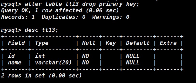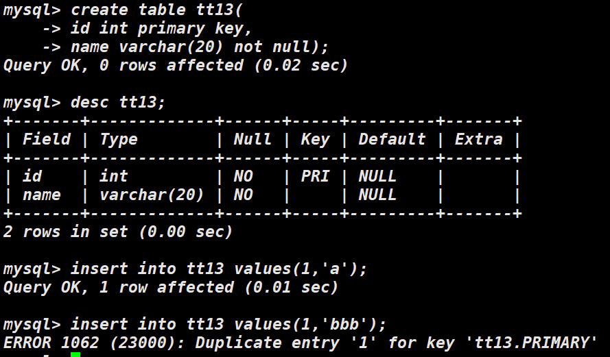我们给id添加主键后,第一次插入id为1的时候是成功的,第二次插入id为1的时候会告警重复。