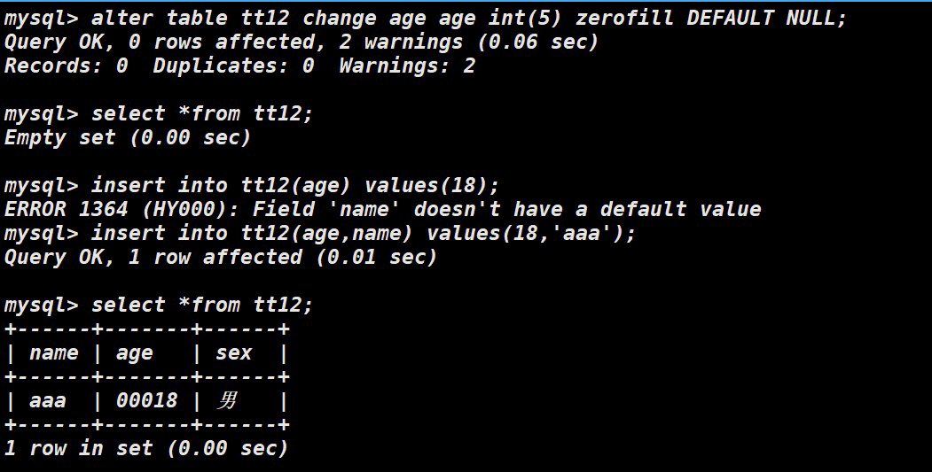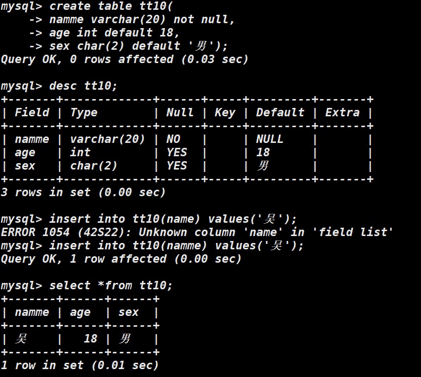当类型设置为 not null 时,我们插入数据不添加该项就会导致报错。