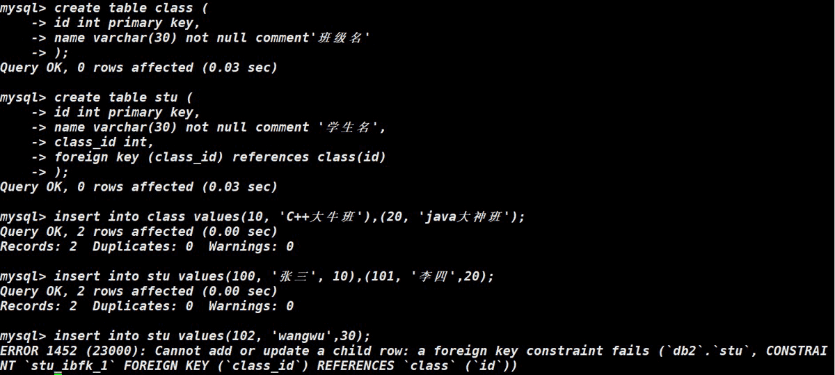 插入一个班级号为30的学生,因为没有这个班级,所以插入不成功