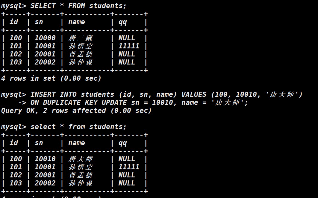 0 row affected:表中有数据冲突,但要插入的值和原先的值一致,所以0行改变