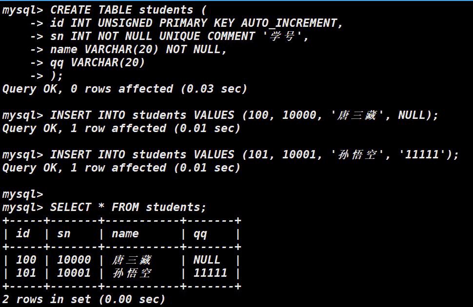 auto_increment:当对应字段不给值时,会按照当前已有的最大值进行+1操作,获得一个新的值。它必须是一个 key 值,并且必须是整数,一张表中最多只能存在一个自增长。