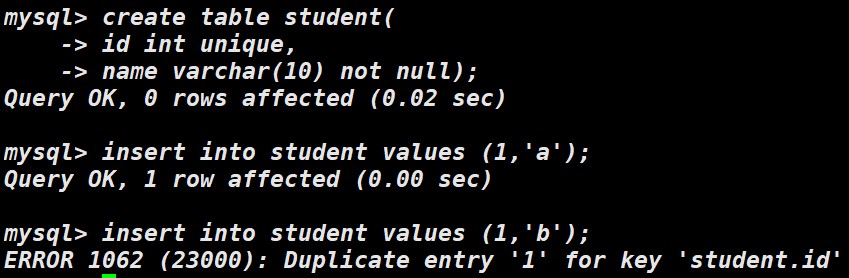 我们用 unique 标识唯一键,此时在id列上 id 就不能重复