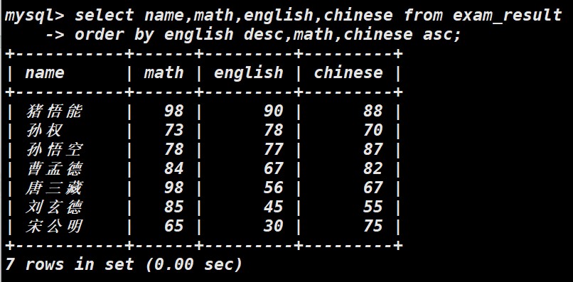 我们通过下面案例可以观察,多个排序是按照第一个优先,在第一个一样的基础上才会进行第二项排序。当我们不加desc或者asc,默认情况下是采用asc(升序),所以我们使用时只用desc即可