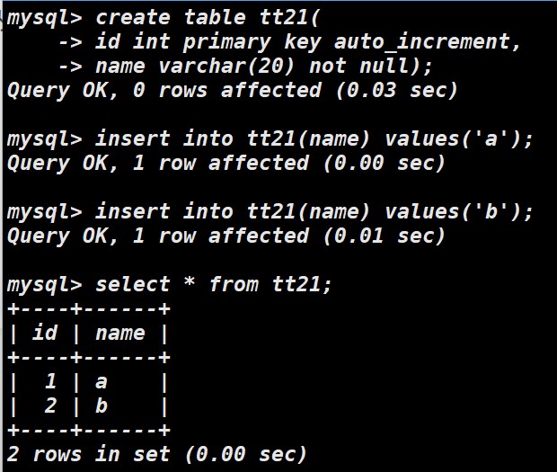 例如我们插入a时 id 默认为1,插入 b 时系统会自动给 id 加上 1