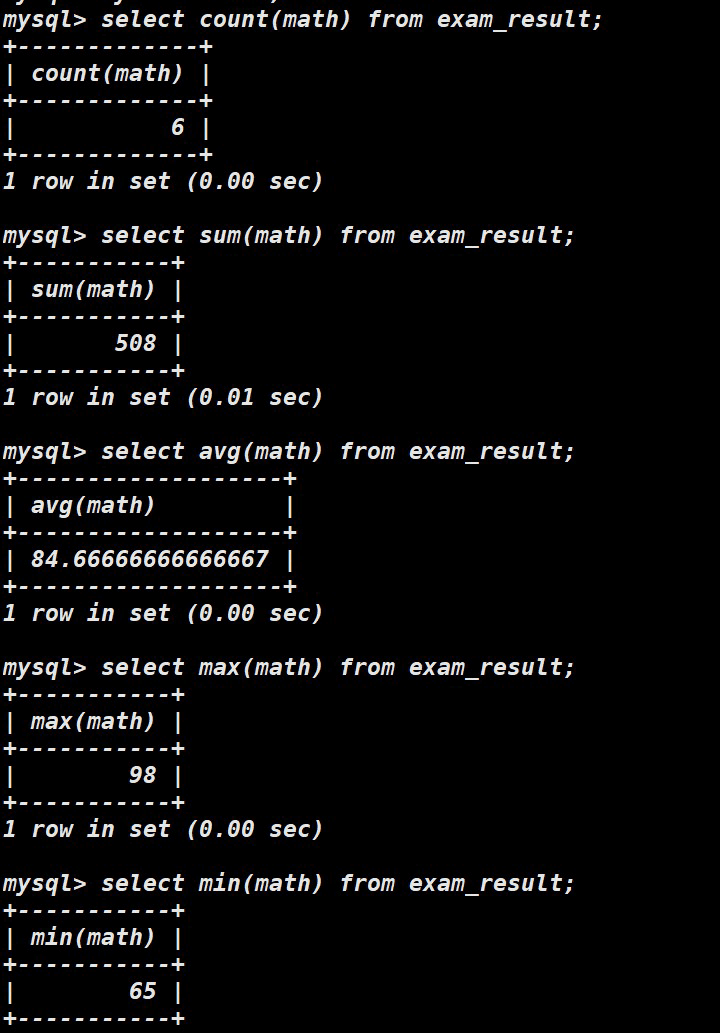 聚合函数类似,count sum avg max min,用于计算列数量,数据总和,平均最大最小值