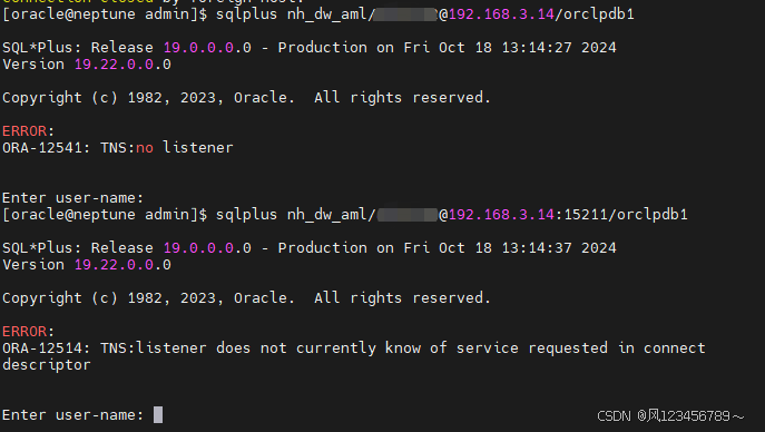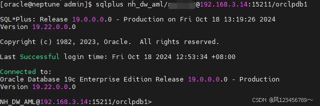 sqlplus nh_dw_aml/xxxx@192.168.3.14:15211/orclpdb1