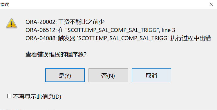create table emp_sal as select * from emp; create table emp_923 as select * from emp where 1=2; create or replace trigger emp_sal_comp_sal_trigg before update on emp_sal for each row begin if :old.sal > :new.sal then RAISE_APPLICATION_ERROR(-20002, '工资不能比之前少'); else insert into emp_923 (empno, sal) values (:old.empno, :old.sal); end if; end;