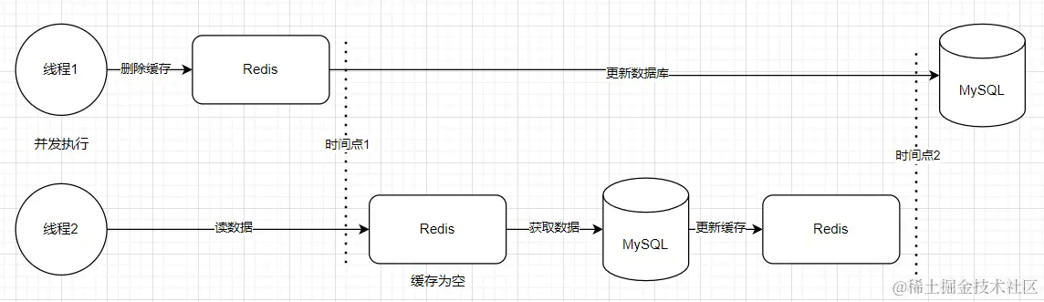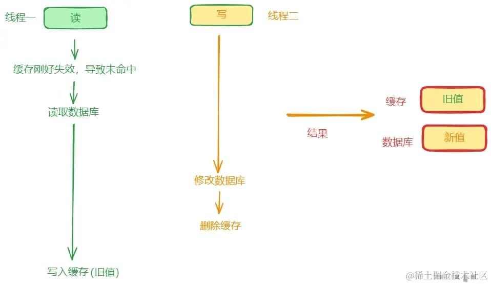 该方案还存在并发引发的一致性问题,假设同时有两个线程进行数据更新操作,如下图所示。当缓存被线程一删除后,如果此时有新的读请求(线程二)发生,由于缓存已经被删除,这个读请求(线程二)将会去从数据库查询。如果此时线程一还没有修改完数据库,线程二从数据库读的数据仍然是旧值,同时线程二将读的旧值写入到缓存。线程一完成后,数据库变为新值,而缓存还是旧值。