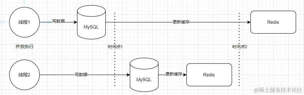 该方案还存在并发引发的一致性问题,假设同时有两个线程进行数据更新操作,如下图所示:
