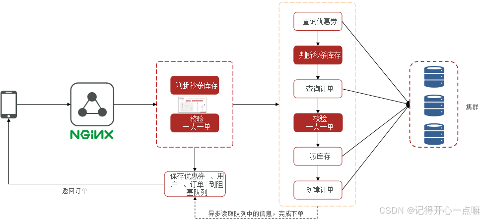 在上面的图示中,我们可以将一条流水线的任务拆成两条流水线来做,如果我们直接将判断秒杀库存与校验一人一单放在流水线A上,剩下的放在另一条流水线B,那么如果流水线A就可以相当于服务员直接判断是否符合资格,如果符合资格那么直接生成信息给另一条流水线B去处理业务,这里的流水线就是咱们的线程,而流水线A也是基于数据库进行查询,也会压力数据库,那么这种情况我们就可以将待查询信息保存在Redis缓存中。