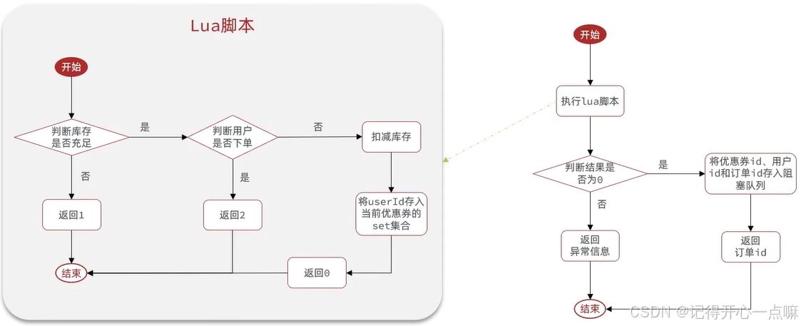 local voucherId = ARGV[1]; -- 优惠劵id local userId = ARGV[2]; -- 用户id -- 库存key local stockKey = 'seckill:stock' .. voucherId; -- 拼接 -- 订单key local stockKey = 'seckill:stock' .. voucherId; -- 拼接 -- 判断库存是否充足 if(tonumber(redis.call('get',stockKey)