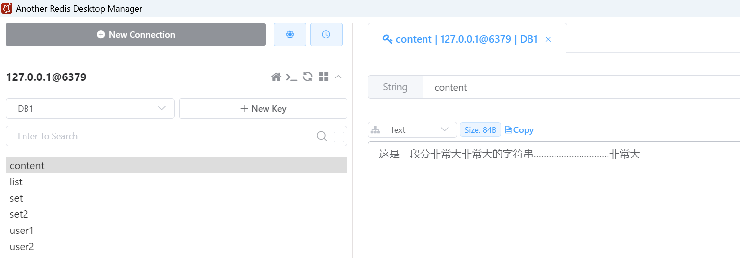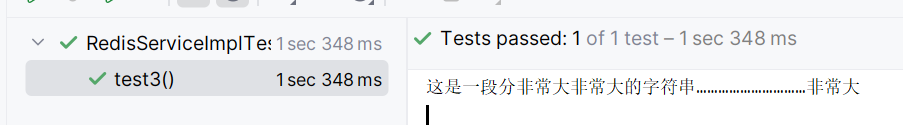 @Test public void test2() { String key = "content"; String value = "这是一段分非常大非常大的字符串…………………………非常大"; redisService.setStrSub(key, value, 5); }