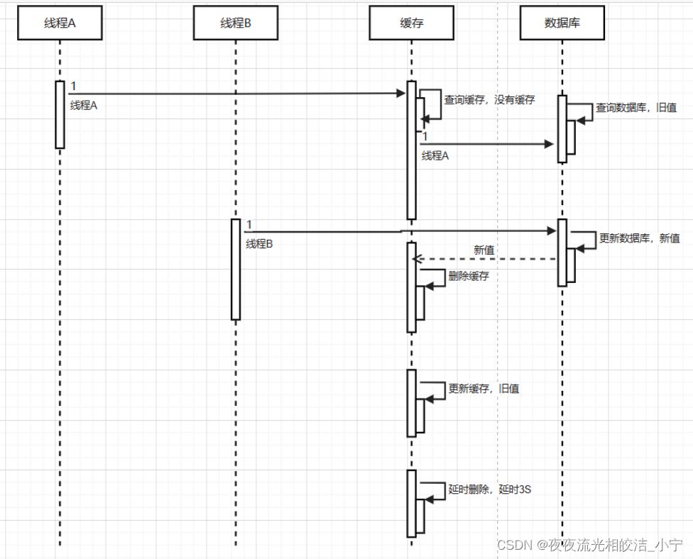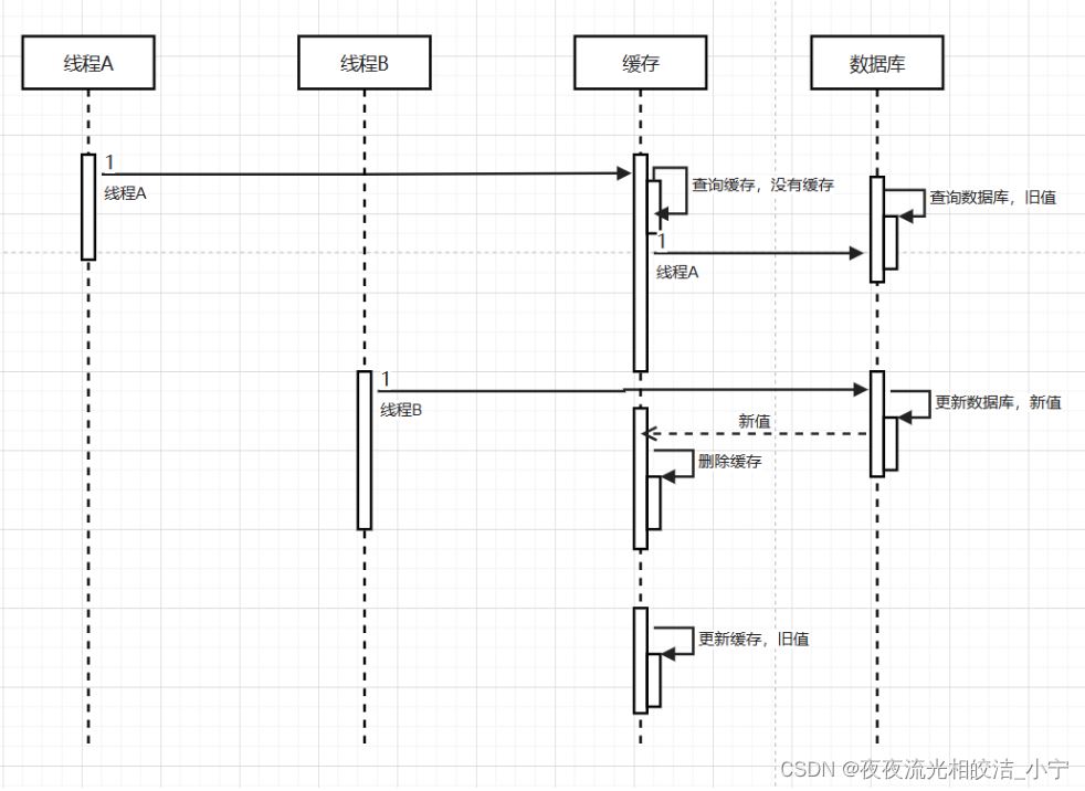 同样有两个并发请求,线程A查询、线程B更新,当线程A查询的时候,缓存刚好失效,然后就去查询数据库拿到数据,在准备写入缓存的时候,CPU资源被线程B抢走,线程B开始更新数据库,然后删除缓存(这一步其实等于无用,因为缓存已经过期)。此时线程A再次获取到CPU资源,然后写入缓存,此时写入的是更新前的旧数据,会产生数据一致性问题。