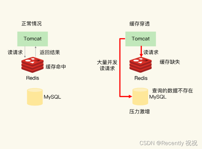 缓存穿透是指要访问的数据既不在 Redis 缓存中,也不在数据库中,导致请求在访问缓存时,发生缓存缺失,再去访问数据库时,发现数据库中也没有要访问的数据,应用也无法从数据库中读取数据再写入缓存,来服务后续请求。缓存也就成了“摆设”,如果应用持续有大量请求访问数据,就会同时给缓存和数据库带来巨大压力