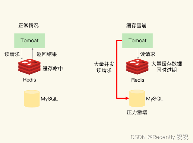 当数据保存在缓存中,并且设置了过期时间时–》某一个时刻,大量数据同时过期–》应用再次访问这些数据,发生缓存缺失–》应用把请求发送给数据库,从数据库中读取数据–》应用并发请求量大,数据库压力大,影响数据库正常业务请求处理