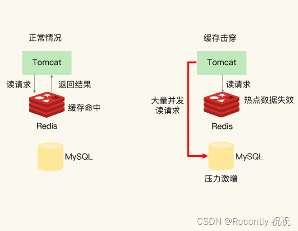 缓存击穿是指,针对某个访问非常频繁的热点数据的请求,无法在缓存中进行处理,访问该数据的大量请求,一下子都发送到了后端数据库,导致了数据库压力激增,会影响数据库处理其他请求。缓存击穿的情况,经常发生在热点数据过期失效时: