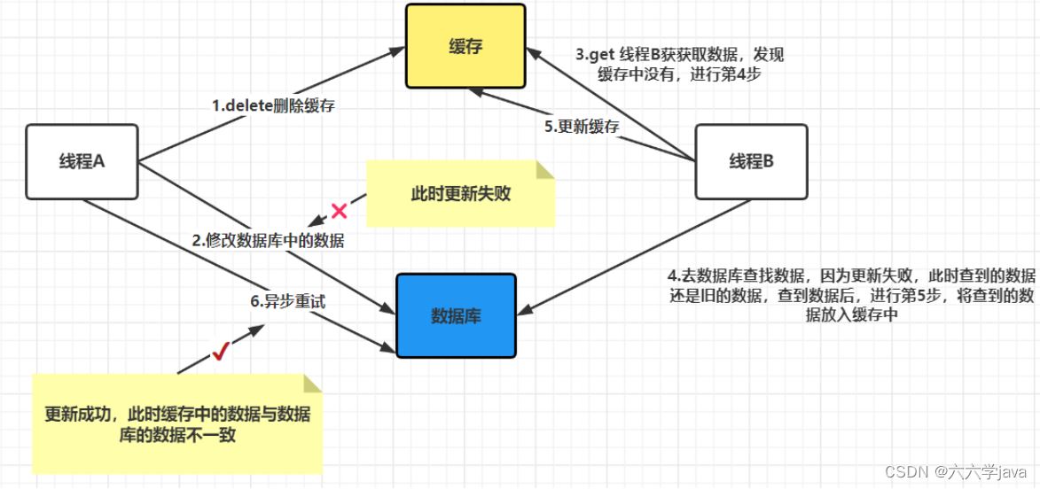 - 线程A更新数据库成功,线程A删除缓存失败;