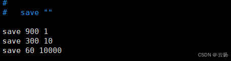 save 900 1 # 表示在900秒内,若至少有1个键值对发生变化,则触发RDB快照,可根据实际需求灵活调整 save 300 10 save 60 10000